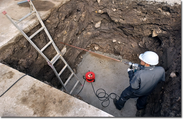 ・まずアース棒を打ち込みます…最初、手作業で石に阻まれて苦戦されていましたが、最終的には電動工具を使用することにより、石を割りながら強引に打ち込めました